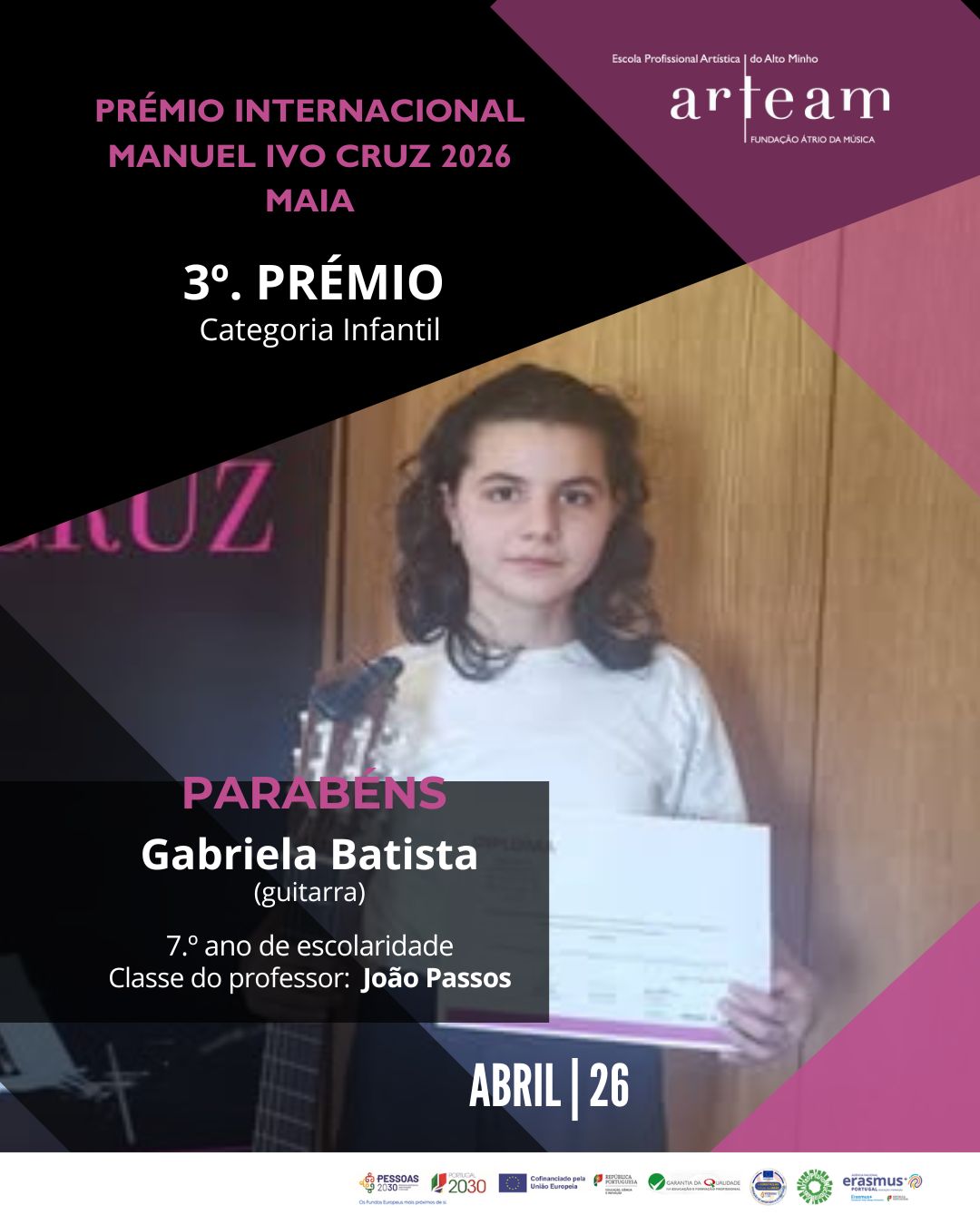 2.º e 3.º Prémios em guitarra, categoria infantil e juvenil para alunos ARTEAM no Prémio Internacional Manuel Ivo Cruz 2026, na Maia